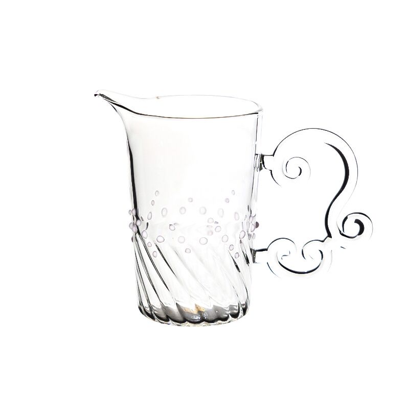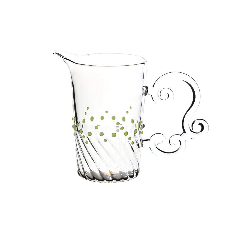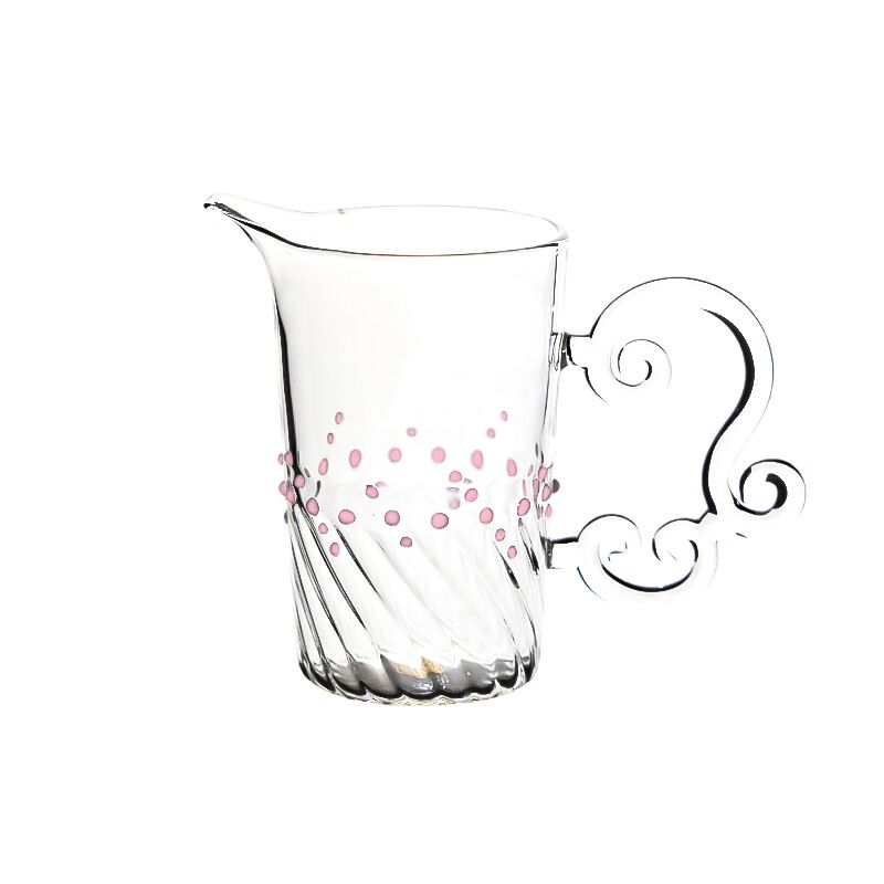 Hand-made heat resistant borosilicate glass teacup,The ergonomic design of the kettle handle is cloud in the sky, which is beautiful and not hot to the hand. Pink or Green or Clear or Purple dot around the body to decorate to make it look more elegant. It can make the tea less bitter.