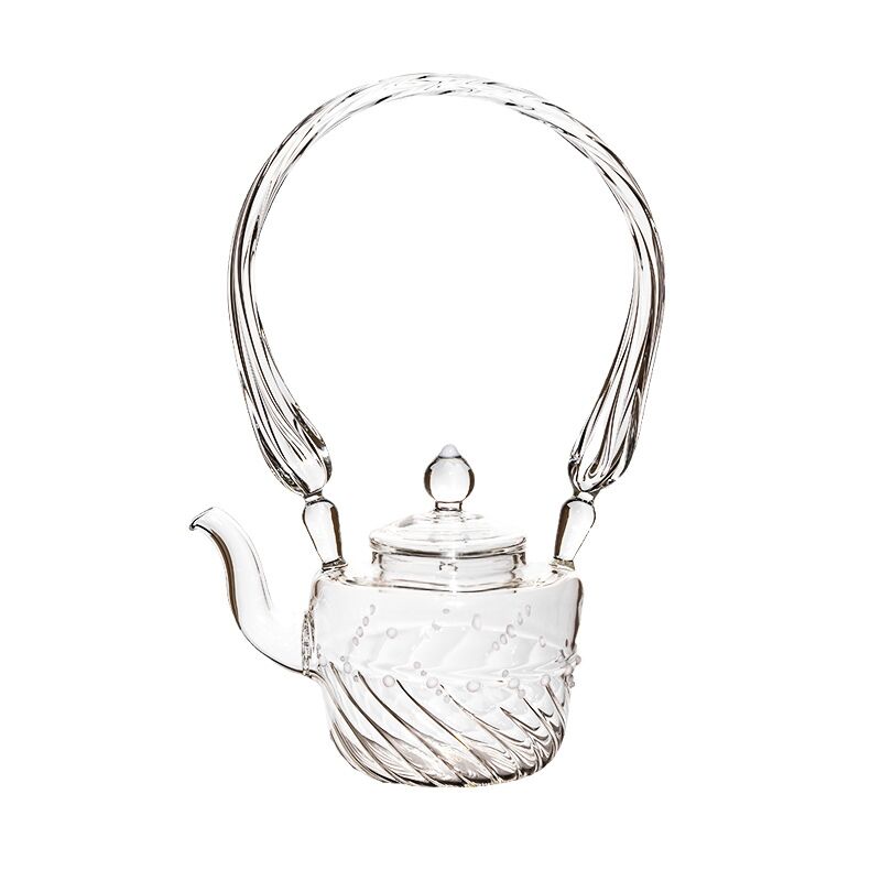 This exquisite glass teapot is a masterpiece of craftsmanship, made from hand-blown, heat-resistant borosilicate glass. Its crystal-clear body elegantly showcases the tea’s color and brewing process, combining beauty and function. The teapot features a large, gracefully arched handle, positioned uniquely on the top of the lid for both style and convenience. The handle is a soft clear hue, adding a modern, artistic touch to its design. Perfect for tea enthusiasts, this durable teapot is designed to withstand high temperatures, making it ideal for steeping a variety of teas while